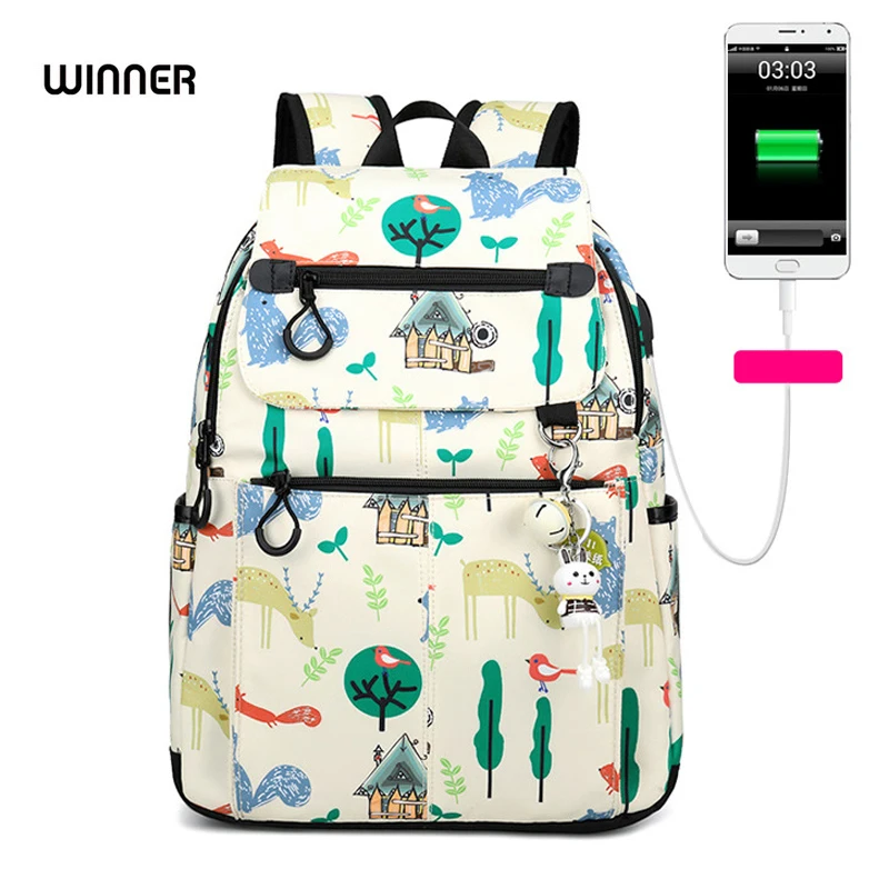 Cheap WINNER Printing USB Charging Backpack Fashion Cartoon Women Laptop Bagpack Anti-theft College Cute